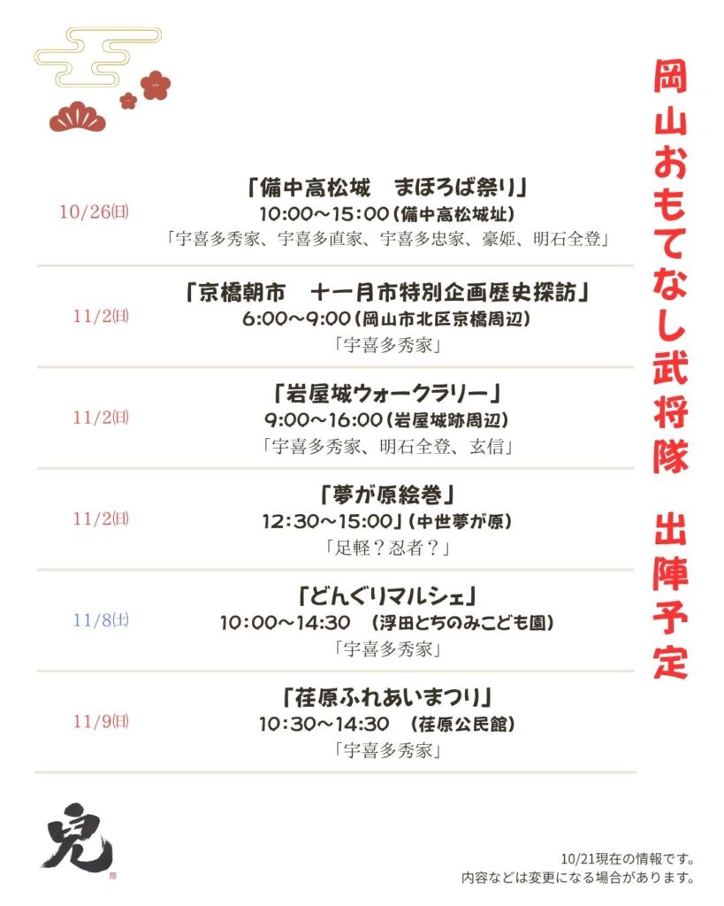 Homepage未分類 井伊 洋之 6時間 ago 武将隊出陣情報「イベント出陣」 岡山おもてなし武将隊 各地のイベントに出陣いたします。詳しくは岡山おもてなし武将隊のSNSなどをご覧ください。 Tweets by okayamabushotai « 武将隊出陣情報「岡山城でJAPANする!?」 Categories: 未分類 井伊 洋之: Related Post 岡山おもてなし武将隊始動! 出会い