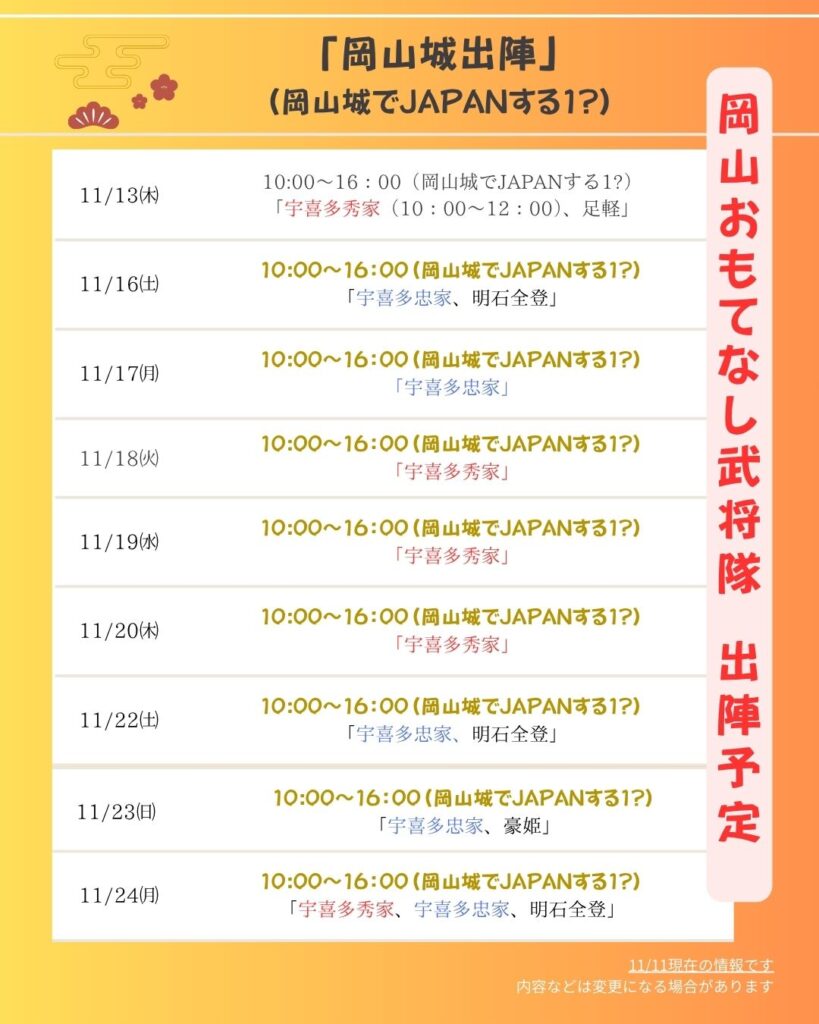 岡山おもてなし武将隊「岡山城でJAPANする!?」11月24日まで 2025年11月11日 お知らせ 岡山城に武将隊が毎日出陣!11月24日までの出陣表を公開しました。※記載のない日は別団体が出陣します。